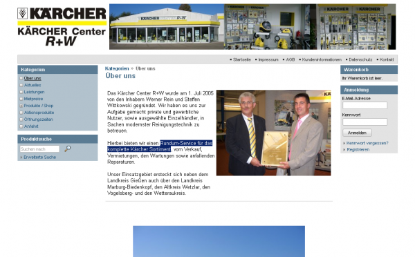 Kärchercenter R+W vertreibt und liefert Rundum-Service für das komplette Kärcher Sortiment. Kärchercenter R+W will mit einem eigenen Webshop mit dem umfangreichen Kärcher Produktangebot im eCommerce vertreten sein.
