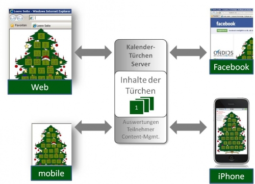 Wertvolle AdventszeitMit der Ondics Solution Multikanal-Adventskalender wird die Adventszeit zur Vertriebs- und Markenzeit. Erreichen Sie Ihre Kunden auf allen Kanälen und binden Sie an Ihre Marke. Ob im iPhone, auf Ihrer Website oder gar in Facebook - der Adventskalender ist in jeder Situation für Ihre Kunden nur einen Klick entfernt - egal, ob im Büro, zu Hause oder Unterwegs. Das bedeutet für Sie: zentrale Pflege des Contents, Anruf auf allen Kanälen. Damit wird nicht nur Aufwand reduziert, sondern auch Fehler vermieden. Abwechslungsreiche WeihnachtszeitDie Türchen im Adventskalender können unterschiedlich bestückt werden: Multimediale Inhalte, Gewinnspiele, Actionsgames, Antragsformulare und vieles mehr - hier sind Ihre Ideen keine grenzen gesetzt. Das Türchen-Content-Management ist sehr flexibel gestaltet. Inhalt können bis kurz vor dem Tag, an dem das Türchen geöffnet werden darf, eingepflegt oider geändert werden. Die Teilnehmer-Daten werden an den Server zurückübertragen und stehen zur zentralisieren Weiterverarbeitung zur Verfügung. |